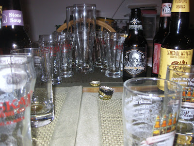 It’s cheap. Simply put Bro and I contribute a few beers each and we try each others selections. We have both made some recent journeys, her to Wisconsin and myself to Indiana, Ohio, Kentucky. We each returned with some not often seen beer. We brought back some six packs and set aside a bottle to share or share a 22 oz bottle. This allows us to expand our beer knowledge beyond our personal budgets. I did not have to shell out for an entire six pack of New Glarus Stone Soup. This is advantageous because 1) I am not a huge Abbey style fan and 2) I wouldn’t have bought a six pack of an abbey anyways. Bro got the benefit of me having too much fun in an Ohio Liquor store and we both go home happy. Of the eight beers she had 4 and I thought 5 of the 8 were worth trying again for sure. A sixth I want to try again to be sure about, but thats one of the 6-packs I had anyways. Check out the pic of the aftermath of a beer tasting. In the future I will give tips on how to put together a beer tasting.